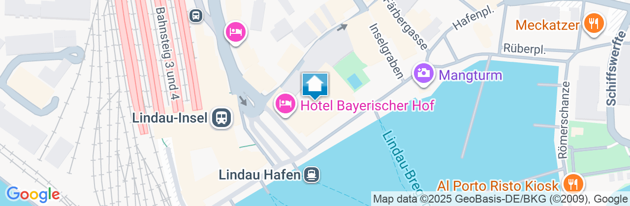 Anreise mit dem PKW: Verlassen Sie die Autobahn A96 bei der Ausfahrt „Lindau“ und folgen der Beschilderung in Richtung „Lindau Insel“. Nach der Überfahrt der Seebrücke bleiben Sie auf der Vorfahrtsstraße, fahren am Inselhallen-Parkplatz vorbei und nehmen die zweite Ausfahrt am Kreisverkehr. Fahren Sie dann weiter bis zum Bahnhof, der sich gegenüber dem Hotel Bayerischer Hof befindet.